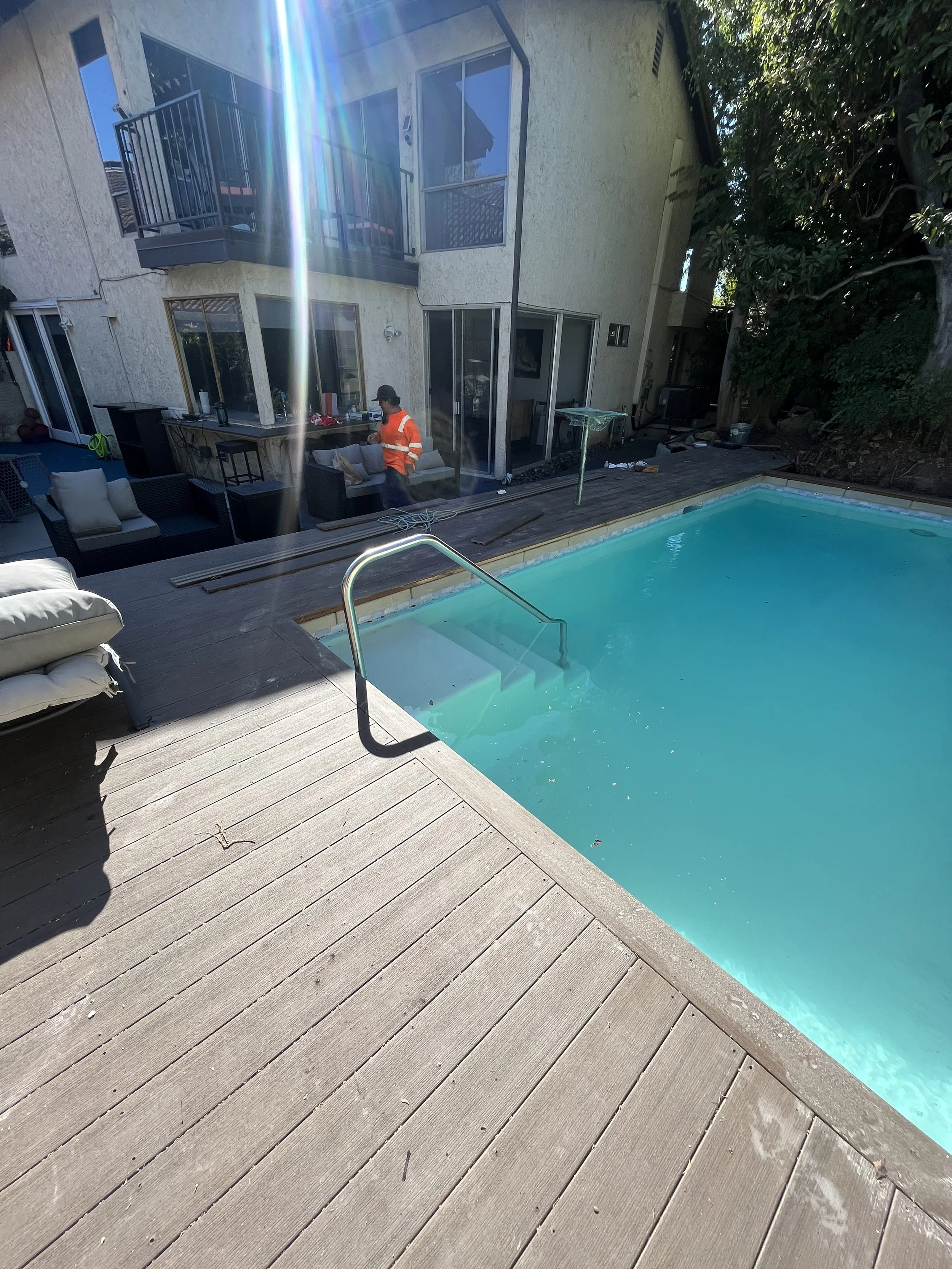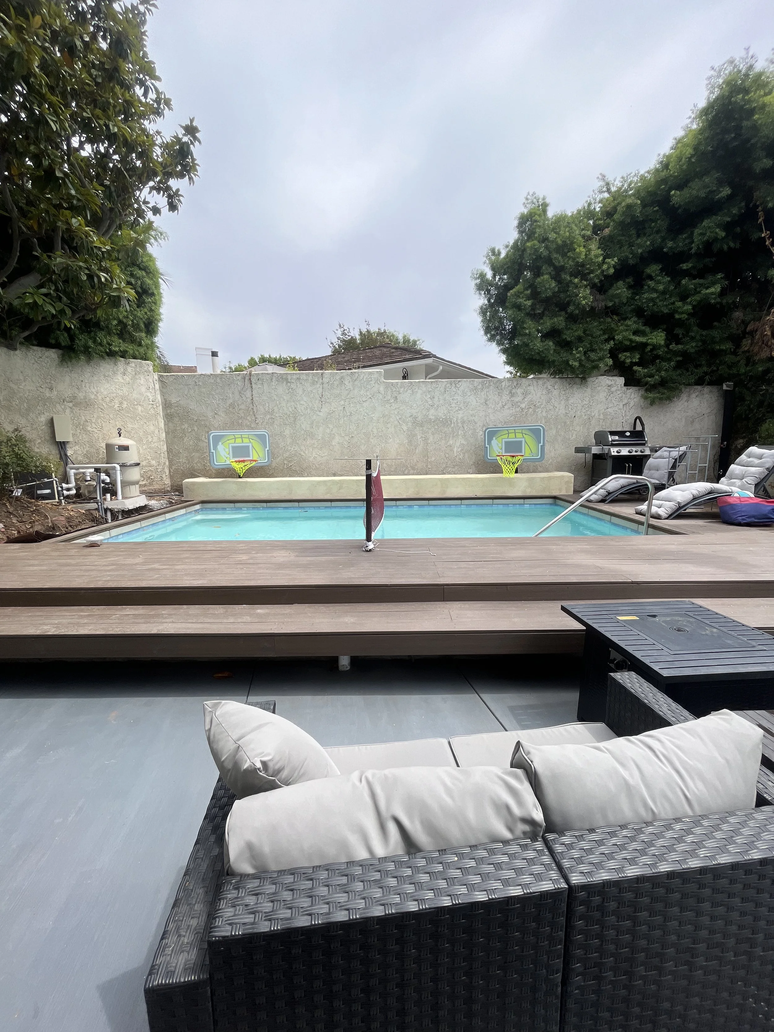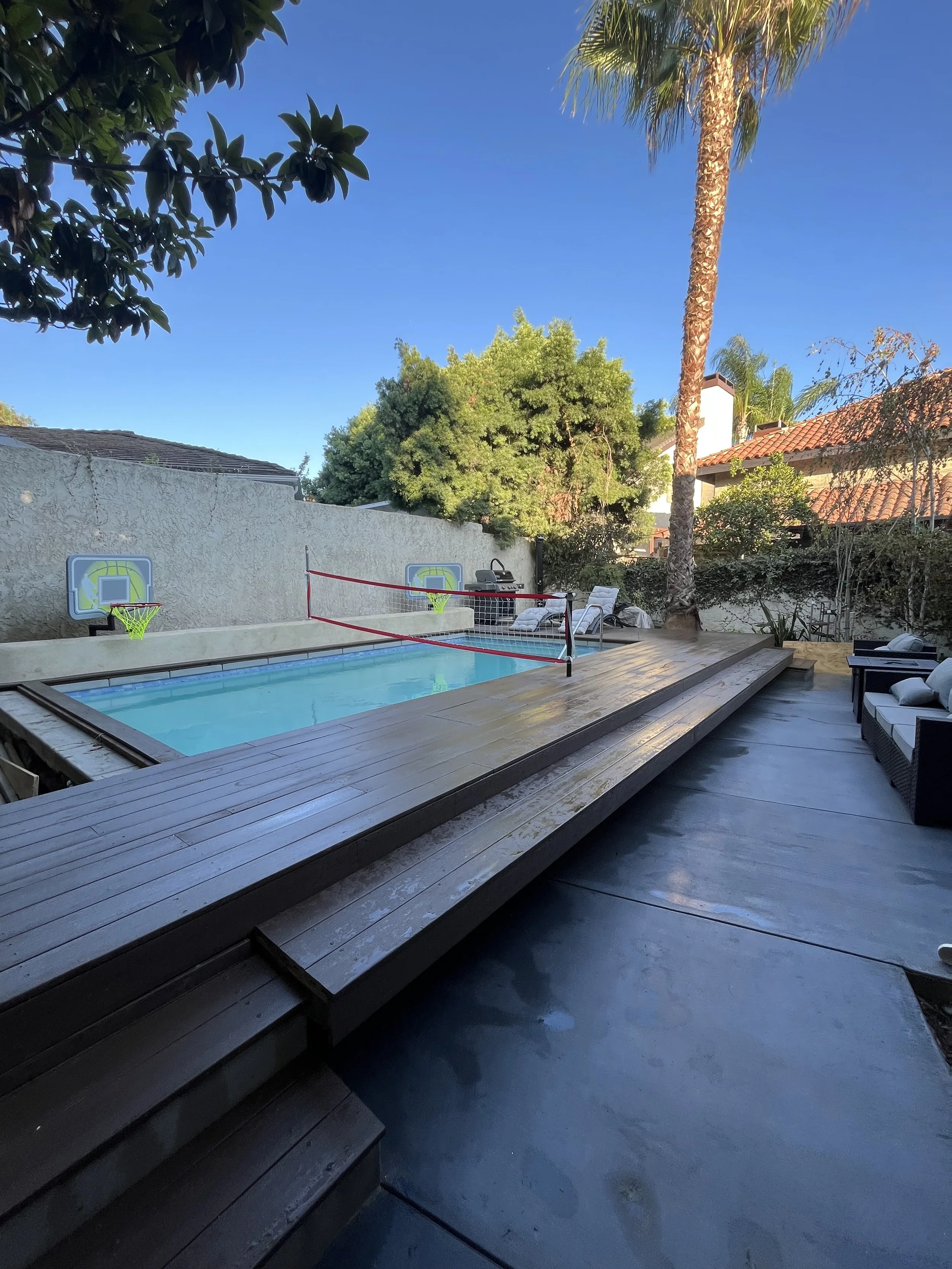 A waterfront home designed as a private retreat, this backyard was envisioned as a vacation-like escape—perfect for unwinding and hosting family and friends. The design features a pool, expansive deck, outdoor shower, and curated furnishings for effortless leisure and entertainment.